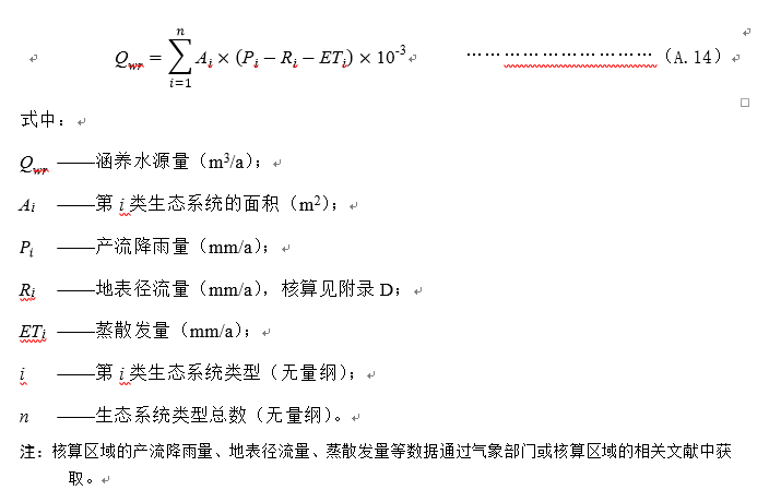 采用水量平衡方程,计算生态系统通过拦截滞蓄降水,增强土壤下渗、蓄积,涵养土壤水分、调节地表径流和补充地下水所增加的水资源总量,核算按式(A.14)。